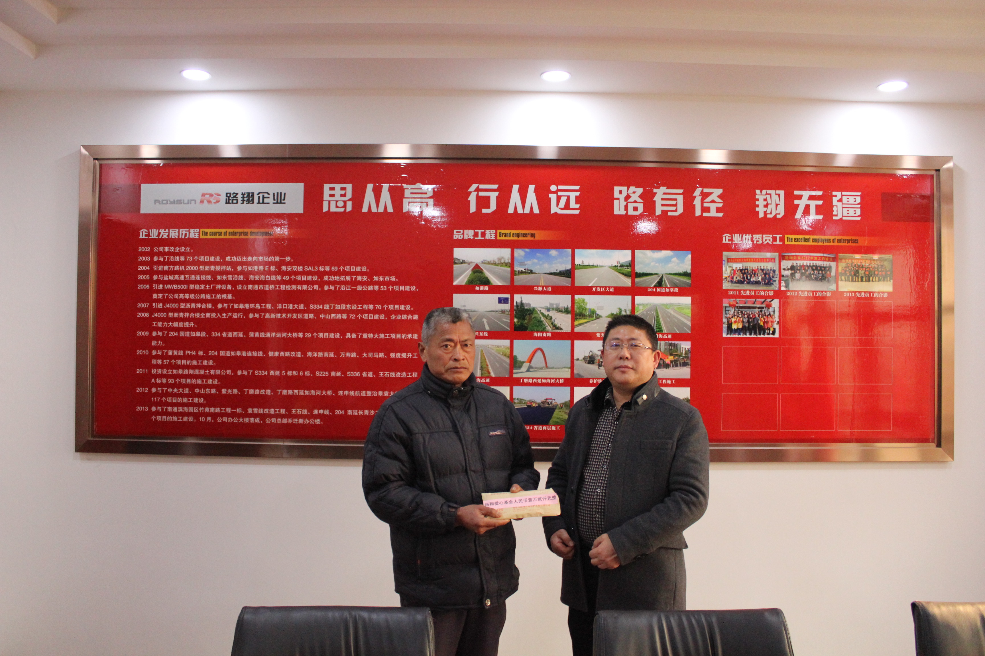 2014年12月,在市慈善基金會領(lǐng)導(dǎo)的關(guān)心和支持下,路翔企業(yè)發(fā)起成立了路翔愛心基金,專門用于本市地區(qū)性的扶貧助困、捐資助學(xué)、災(zāi)害救助、社區(qū)建設(shè)、傳統(tǒng)文化教育及其他慈善資助活動!奥酚袕、愛無疆、翔無涯”,我們堅(jiān)信:有了路翔愛心基金這個(gè)回饋社會的平臺,路翔人一定會將愛的接力棒更好地傳承下去并發(fā)揚(yáng)光大。[總經(jīng)辦 朱洪鋼] |